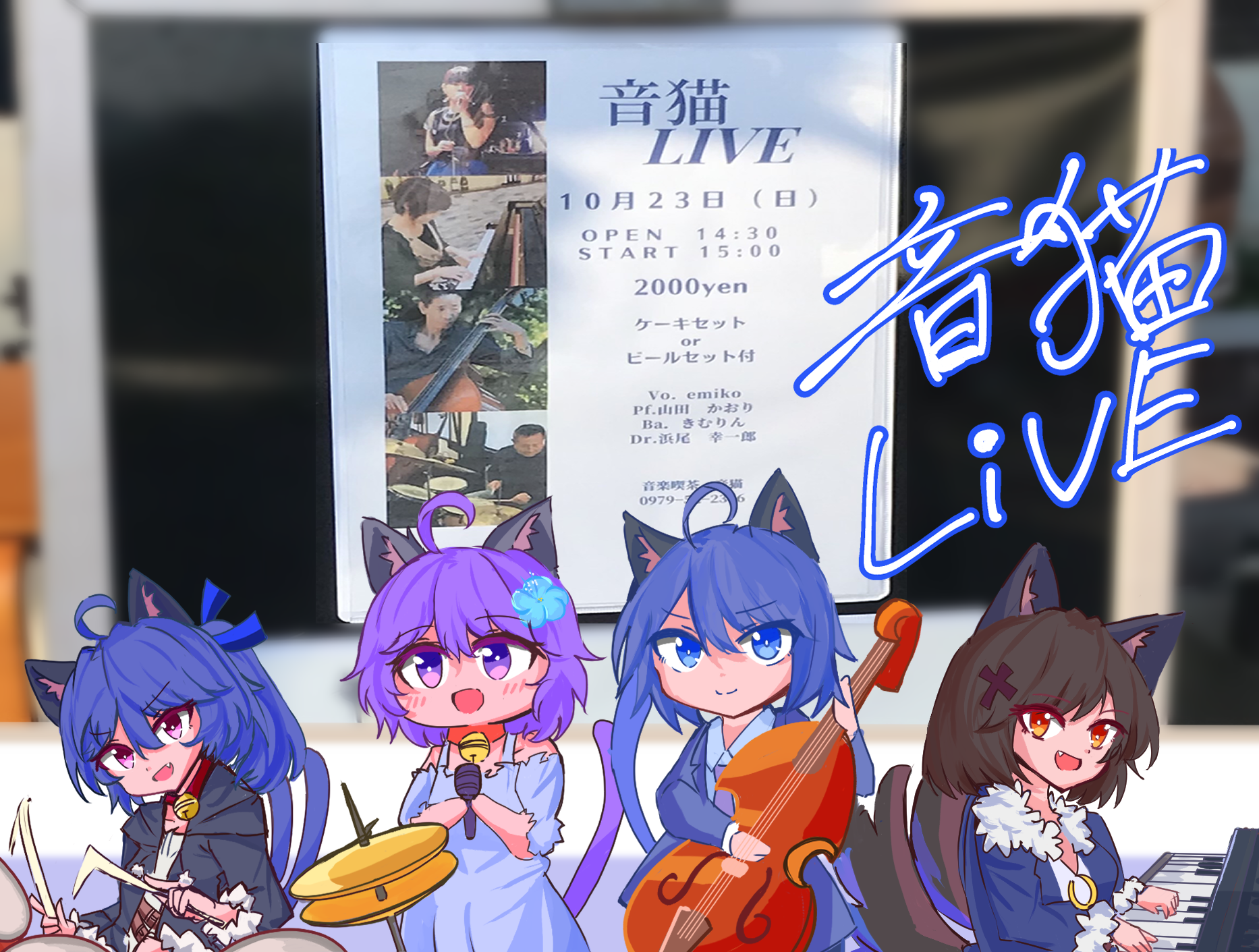 演奏中、楽譜のそばに飾っていただいたボーカルねこちゃんと、ベーシストねこちゃんのアクリルキーホルダー。このブログの管理人が作成させていただきました。ありがとうございます。1個500円。ここの喫茶店で発売中。